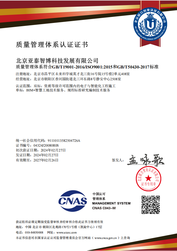 近日,北京BG大游官方网站智博科技发展有限公司顺利取得ISO9001质量管理体系、ISO14001环境管理体系、ISO45001职业健康安全管理体系认证,管理体系覆盖的产品和服务范围包括电子与智能化工程施工;BIM+智慧工地技术服务、规程标准研究编制技术服务。此次三标管理体系认证证书的取得,为智博科技公司增强市场竞争力、提升公司信誉度提供了强有力的保障。(李京月)