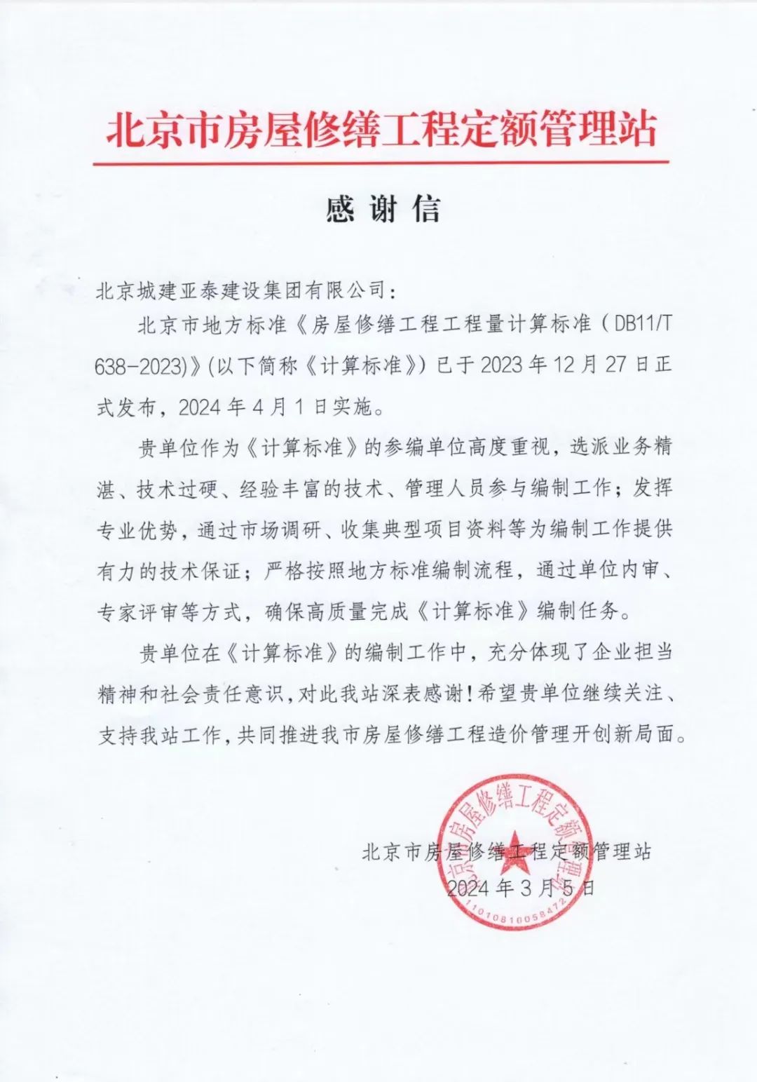 3月5日,北京市房屋修缮工程定额管理站发来感谢信,对集团公司业务人员在北京市地方标准《房屋修缮工程工程量计算标准(DB11/T638-2023)》编制过程中发挥专业优势,高质量完成编制任务表示感谢。(李继业)