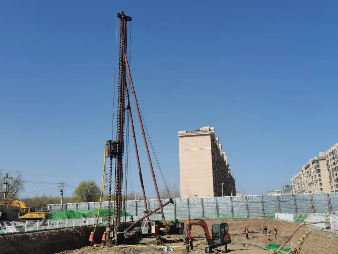 3月29日上午,在完成基坑土方阶段性施工后,由第四工程管理公司承担施工的赵全营C4公交场站工程桩基开钻。图为现场施工基础桩施工。(四管)